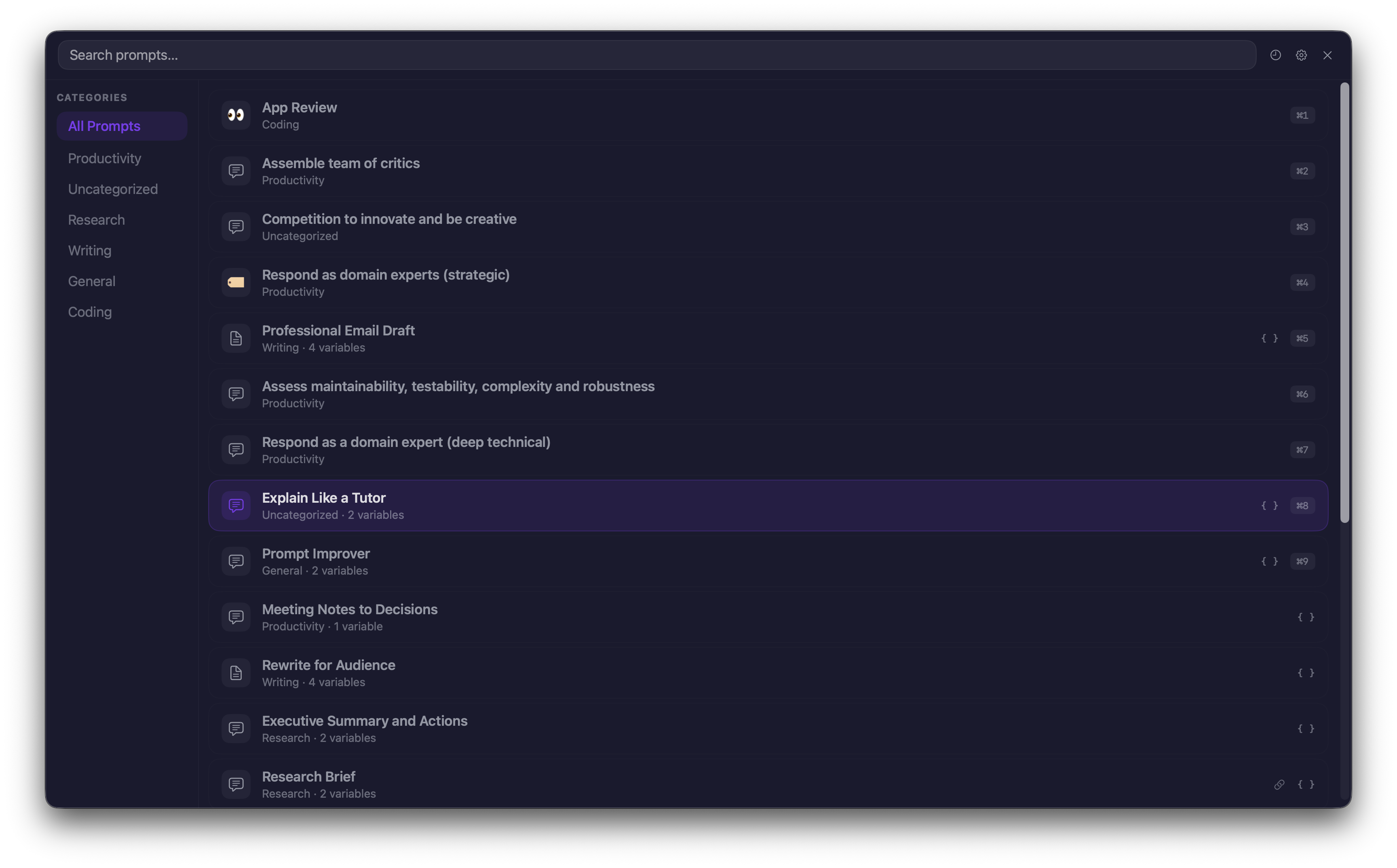 Press a shortcut, pick a prompt, paste it into ChatGPT, Claude, Gemini, or whatever you're using. That's it.